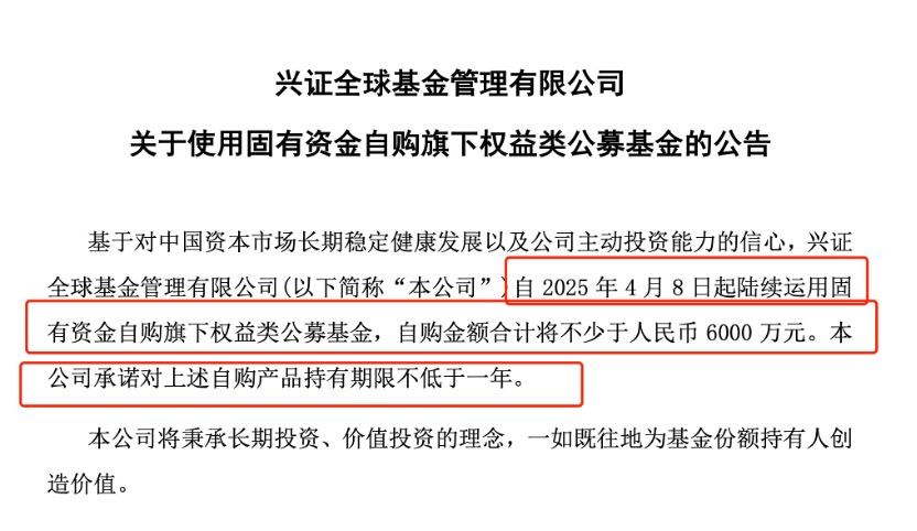 4月9日,兴证全球基金6000万元自购接力。公司表示,基于对中国资本市场长期稳定健康发展以及公司主动投资能力的信心,公司已经自4月8日起陆续运营固有资金自购旗下权益类公募基金,自购基金不少于6000万元,并承诺对上述自购产品持有期限不低于1年。