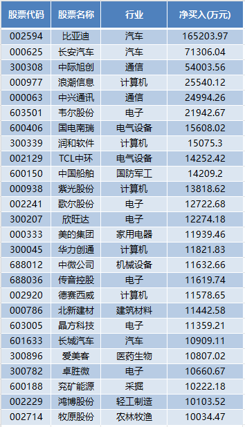 比亚迪作为新能源车龙头,连续获得北上资金的增持,本周净买入16.52亿元,为唯一净买入超10亿元的个股,增持664万股,总持仓1.05亿股,创历史新高。