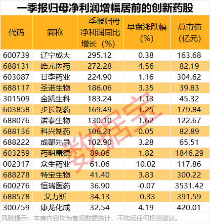 从业绩上来看,创新药板块步入快速放量期,行业盈利能力明显增强。A股一季报数据显示,有37只创新药概念股归母净利润同比增长,其中辽宁成大、皓元医药、甘李药业等9股归母净利润实现翻倍,艾迪药业、昭衍新药扭亏为盈,13股同比减亏,报喜比例超过三分之二。