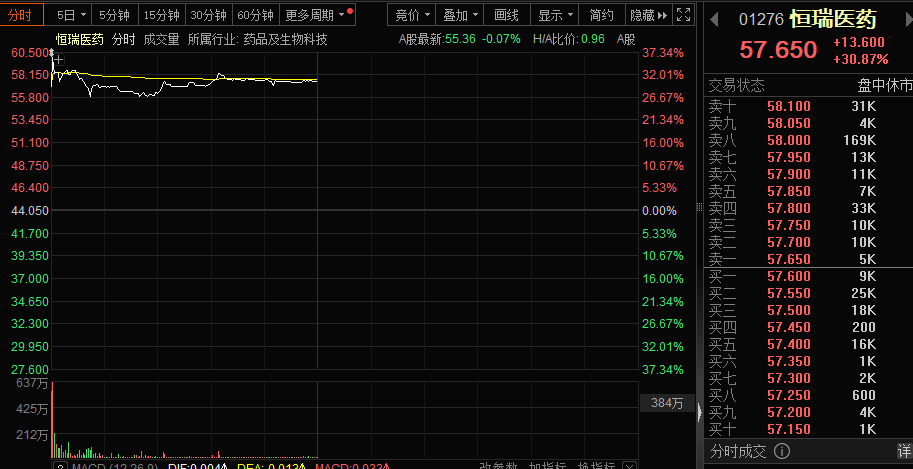 早盘恒瑞医药开盘后一度拉升,最高涨幅达到37.34%,午间收盘上涨30.87%,换手率超过30%,A股表现一般,午间收盘微跌0.07%。截至午间收盘,恒瑞医药A股市值超3531亿元,H股市值129.42亿港元。