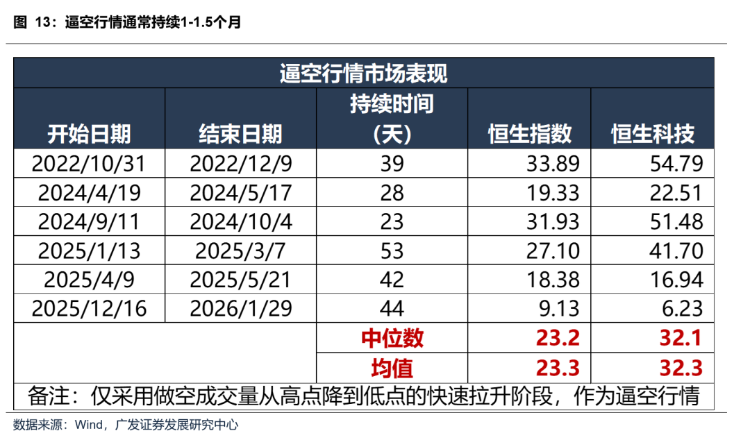 当前做空成交量占比约12%,已与21-22年港股熊市类似,触及历史高位。做空高企不预示市场下跌或者反弹,港股的核心驱动因素仍在于基本面变化,但如果行情回暖,可能触发逼空行情放大反弹力度。如果没有额外的基本面/政策面等因素驱动,二季度主要是利空出尽,流动性边际改善,导致的逼空行情发生,预计逼空反弹持续时间在1~1.5个月左右,恒指、恒科的涨幅分别在20%和30%左右,反弹可能会修复今年一季度以来的下跌,但仍然是以补缺口为主,难以破前高。