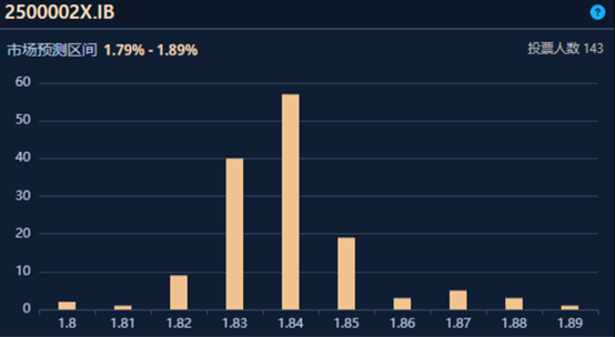 从DM平台上投资者对“25超长特别国债02”本次续发结果的预测来看,预测区间落在1.80% 至1.89%,预测1.84%的人数最多,续发招标结果符合市场预期。