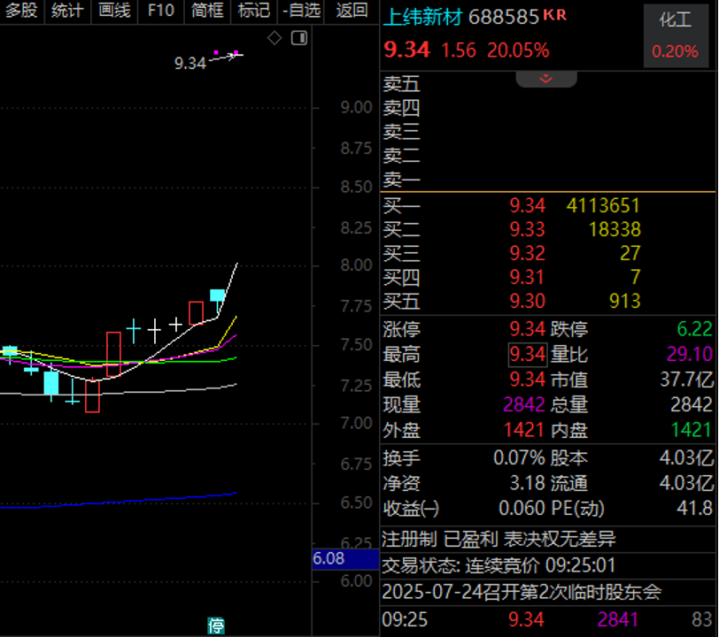 今天(7月9日)早盘,机器人概念开盘集体大涨,上纬新材(688585)开盘“20cm”涨停,集合竞价后封单超过411万手,超过其总股本。此外,恒工精密开盘也“20cm”涨停,大丰实业、宁波华翔等机器人概念股开盘涨停。