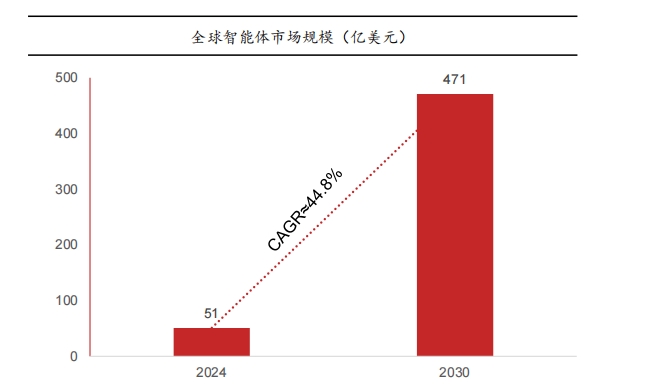 根据麦肯锡等多份权威报告,在多元化需求驱动下,智能体市场呈爆发式增长态势,2024年全球智能体市场规模约为51亿美元,预计2030年将飙升至471亿美元,复合年增长率高达44.8%。