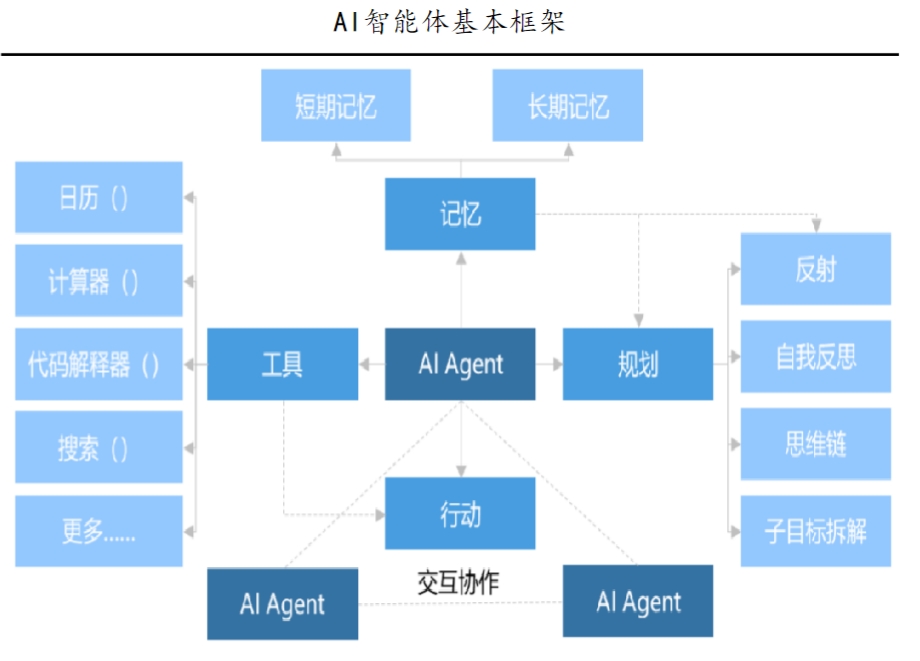 华西证券分析师刘泽晶、赵宇阳2月7日研报指出,AI智能体(AI Agent)是指能自主感知环境、做出决策并执行行动的系统,具备自主性、交互性、反应性和适应性等基本特征,能在复杂多变的环境中独立完成任务,包括记忆、规划、工具、行动四个主要模块。