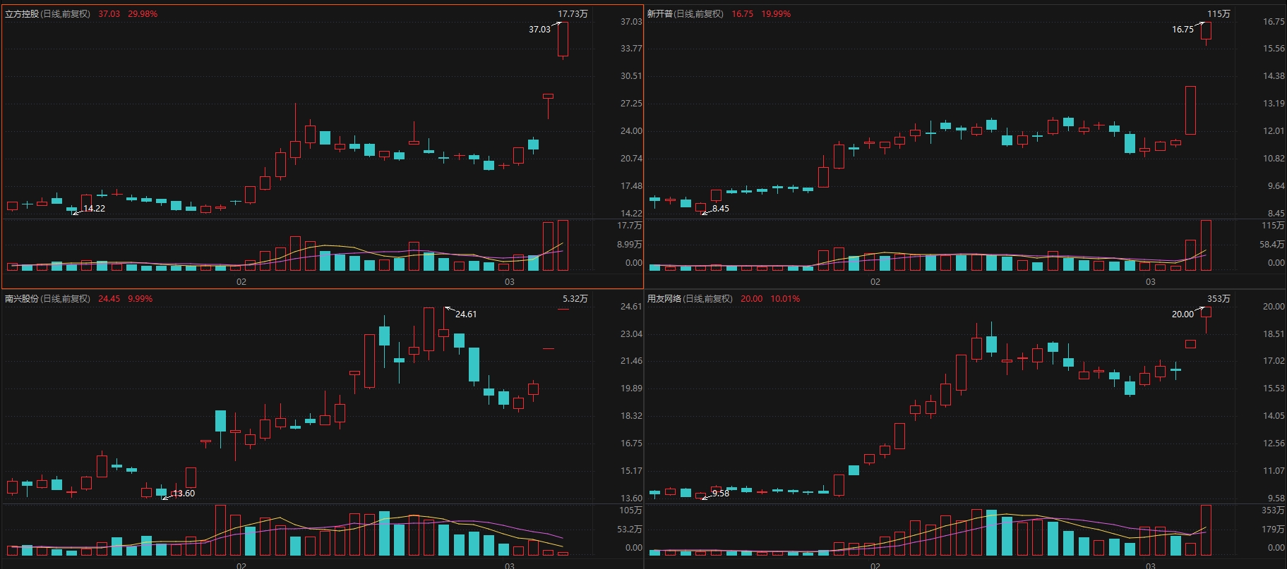 AI智能体概念掀涨停潮,截至周五收盘,自建智能体Agent的立方控股30CM两连板,推出智慧校园智能体服务AI产品小美同学的新开普20CM两连板。聚焦数智生态、智慧体验空间两大产品方向的正和生态、有人工智能助手小鹭的南兴股份、构建深耕于社区养老以及居家养老场景AI Agent的国脉科技、已发布基于智能体、人机交互等框架的智能助理等通用型产品的用友网络两连板。智能平台功能丰富的云赛智联、开发有如意AI导购智能体的返利科技涨停。