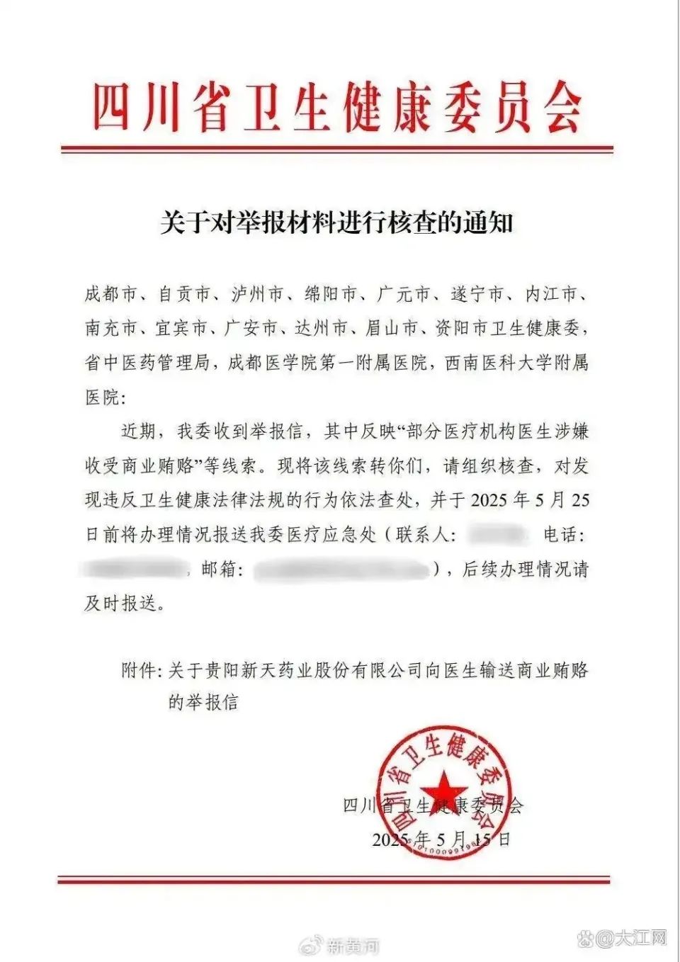 通知附件中提到被举报对象为贵阳新天药业股份有限公司成都分公司,涉及四川省内多个城市的37家医疗机构、超百名医生。