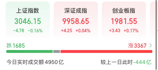 上午收盘,上证指数下跌0.16%,深证成指上涨0.04%,创业板指上涨0.17%,逾3300只个股上涨。
