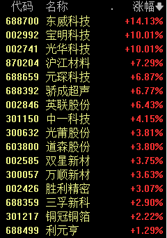 今天上午,新能源赛道迎来反弹,其中,PET铜箔板块涨势最显著,东威科技、宝明科技、光华科技等个股涨幅居前。