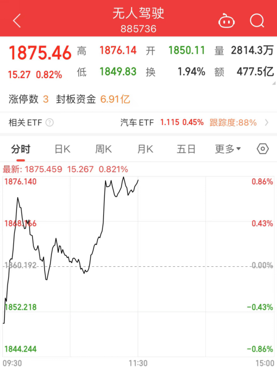 今天上午,无人驾驶板块盘中直线拉升,路畅科技、海马汽车等多股涨停。
