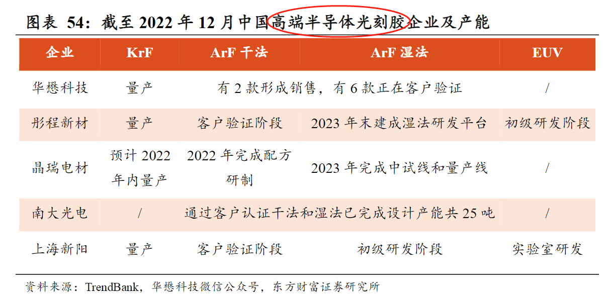 3)目前中国高端半导体光刻胶企业主要有5家:华懋科技、彤程新材、晶瑞电材、南大光电、上海新阳