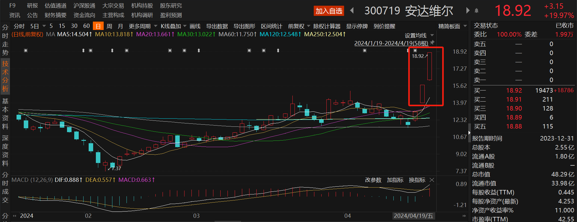 4月20日讯 本周A股一季报行情热火朝天,一季度净利同比最高预增455%的同为股份周五收盘六连板,净利同比最高预增8.37倍的安达维尔收盘连续两个20CM涨停,净利同比最高预增37.9倍的赣能股份周三录得两连板。此外,披露业绩预增/预盈公告次日,肇民科技和佰维存储收盘20CM涨停、正丹股份盘中最高涨超19%、荣泰健康和丽尚国潮一字涨停、宝光股份收盘涨停。