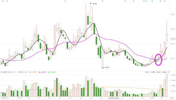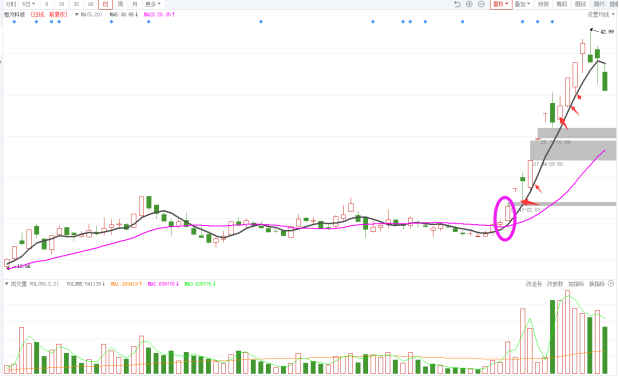 (2)5日和20日均线形成多头排列后,价格短暂出现下跌先是跌破5日均线但又快速收回来,此时视为第二个买点。