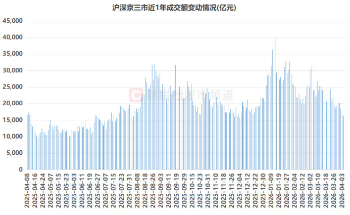 注:沪深京三市近1年成交额变动情况(截至4月7日收盘)