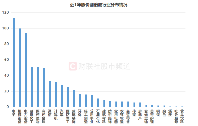 注:近1年股价翻倍股行业分布情况(截至4月7日收盘)