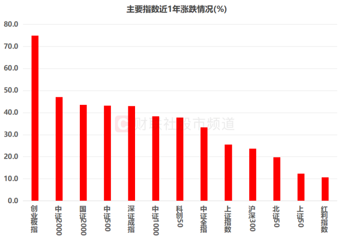 以近1年行情(2026年4月7日收盘价较2025年4月7日收盘价)计算,市场主要指数均迎来亮眼涨幅,且中小盘股指数表现活跃。具体来看,创业板指以74.9%的幅度领跑市场,中证2000、国证2000、中证500、深证成指紧随其后,近1年涨幅也在40%以上。而红利指数、上证50、北证50只则涨幅相对靠后,幅度均不足20%。