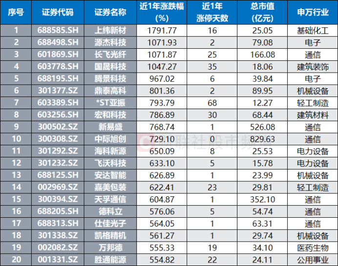 具体个股方面,剔除新股,累计共有4股近1年涨幅在10倍以上,分别为上纬新材、源杰科技、长飞光纤、国晟科技,另有腾景科技涨幅超9倍,合计“10倍股”共5只。同时,鼎泰高科、*ST亚振、宏和科技、新易盛、中际旭创、海科新源、飞沃科技、安达智能、嘉美包装、天孚通信、德科立等股也涨幅居前。