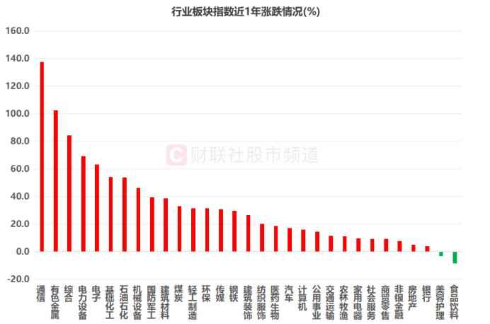行业层面(申万一级)来看,以近1年行情统计,31个申万一级板块中共有29个行业在此期间收涨,比例接近93.5%。其中,通信、有色金属板块唯二涨幅超100%,分别达137.6%、102.5%。综合、电力设备、电子、基础化工、石油石化、机械设备等板块也涨幅居前,而唯有食品饮料、美容护理两个板块录得收跌。