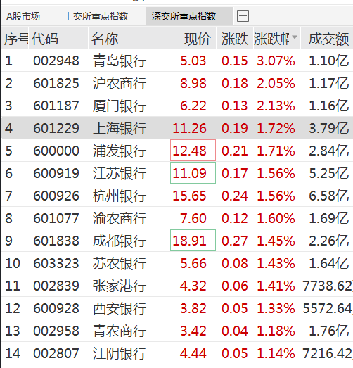 银行股今日早盘再次集体走高,截至发稿,青岛银行涨超3%,沪农商行、厦门银行等涨超2%,上海银行、浦发银行、江苏银行等多股涨超1%。