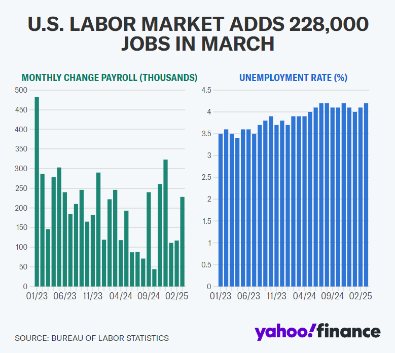 数据显示,4月非农就业人数预计新增13.3万,失业率料维持在4.2%。相比之下,美国经济3月新增22.8万个就业岗位,而失业率上升至4.2%。