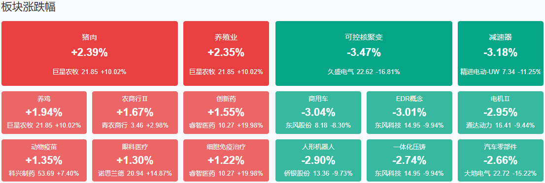 板块方面,猪肉、创新药、银行、CRO等板块涨幅居前,黄金、草甘膦、可控核聚变、人形机器人、环保设备、消费电子等板块跌幅居前。截至收盘,沪指跌0.47%,深成指跌0.85%,创业板指跌0.96%。