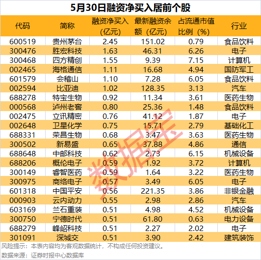 具体到个股,5月30日获融资净买入千万元以上的有202只,其中22只融资净买入额超5000万元。贵州茅台融资净买入额居首,当日净买入2.45亿元,其次是胜宏科技、四方精创,融资净买入金额分别为1.63亿元、1.55亿元,融资净买入金额居前的还有海格通信、会稽山、比亚迪等。
