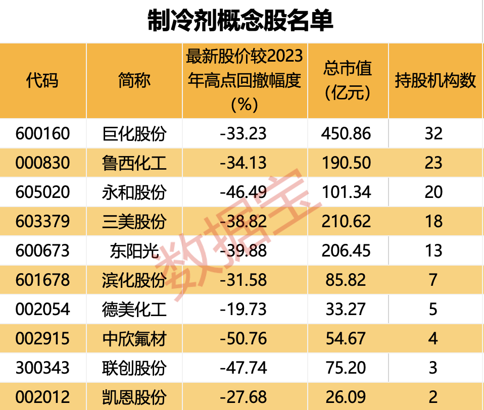 以最新收盘价较2023年高点的回调幅度来看,10只制冷剂概念股平均回调37%,其中中欣氟材、联创股份、永和股份回调幅度均超40%。