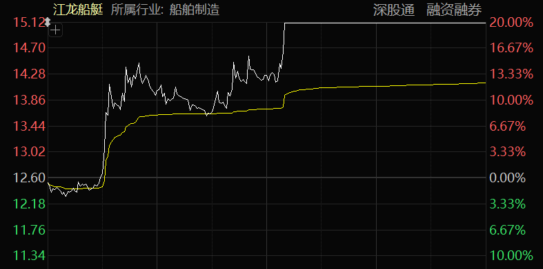 午后军工板块局部异动,船舶方向领涨,江龙船艇直线拉升至20%涨停收盘。