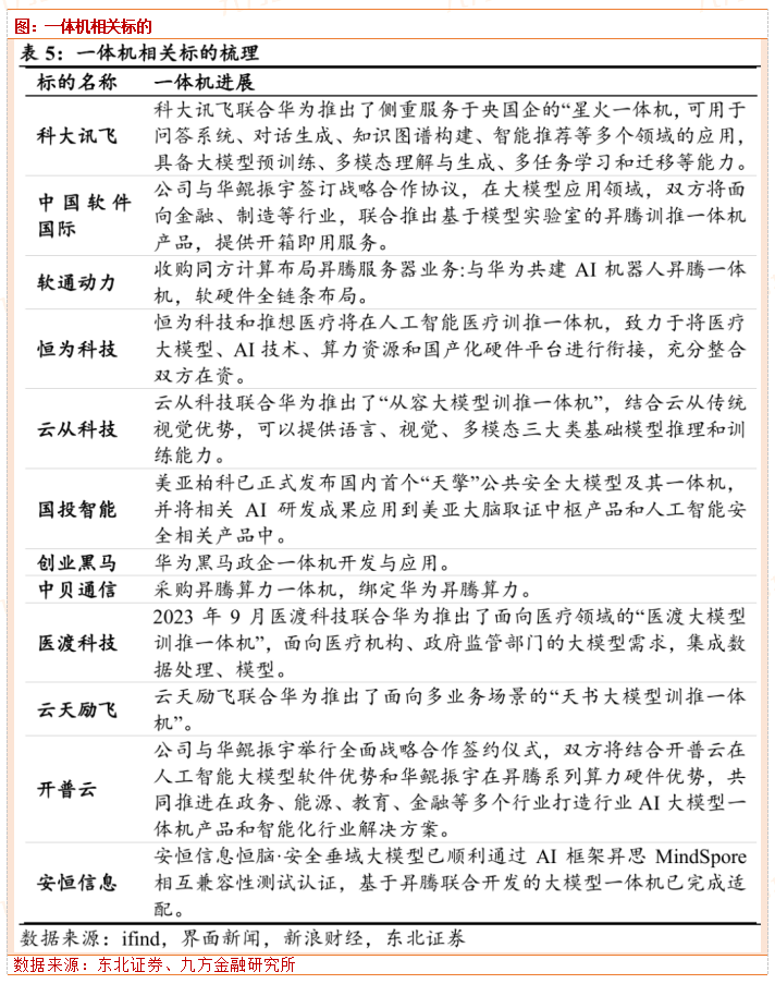 国内各厂商陆续发布合作款昇腾一体机,应用范围由科研逐步扩展到AI 全场景乃至垂类模型落地。2023年3月,华为昇腾与旗下华鲲振宇打造了专为高校和科研院所设计的AI训练开发一体机,奠定了将AI算力、 AI 平台软件、AI开发框架、开发组件和存储高效融合的算力底座基础架构;2023年6月,软通动力发布训推一体化平台,支持用户一站式AI开发、深度适配不同AI应用场景;2023年8月起云从科技、科大讯飞、智谱AI等国内领先AI大模型厂商合作款昇腾一体机面世,昇腾一体机应用范围扩展到 AI 全场景;10 月中国软件国际将整体硬件加上 ModelLab 模型产品软件一起,打造“昇腾云云端GPU+混合云算力一体机”,除内置相关软件外,该一体机还将内置开源大模型和标准的数据集,并且可通过接口调用外部商业大模型。