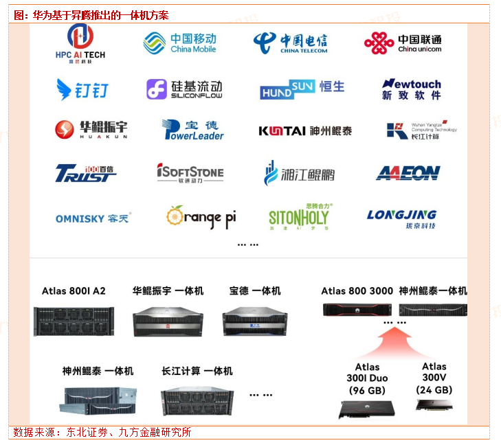 AI 计算需求爆发+政策指引+数据安全考虑,推出一体机大势所趋。昇腾一体机将计算资源、AI 平台软件和各类模型算法集成在一个设备中,维护数据安全性,满足央国企与政府大模型本地化部署的刚需。华为提供昇腾AI综合解决方案,为大模型开发和运行提供分布式并行加速、算子和编译优化、集群级通信优化等关键能力,支撑客户开箱即用,直接使用大型预训练模型,从而降低了技术门槛。