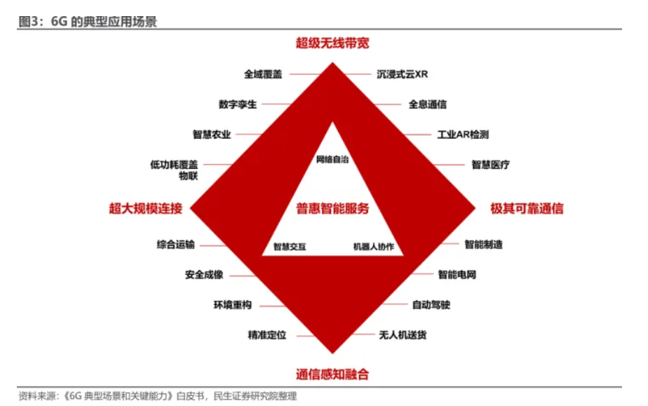 6G通信应用场景更加多元。超级无线宽带、超大规模连接、极其可靠通信、普惠智能服务、通信感知融合是6G通信五大应用场景。