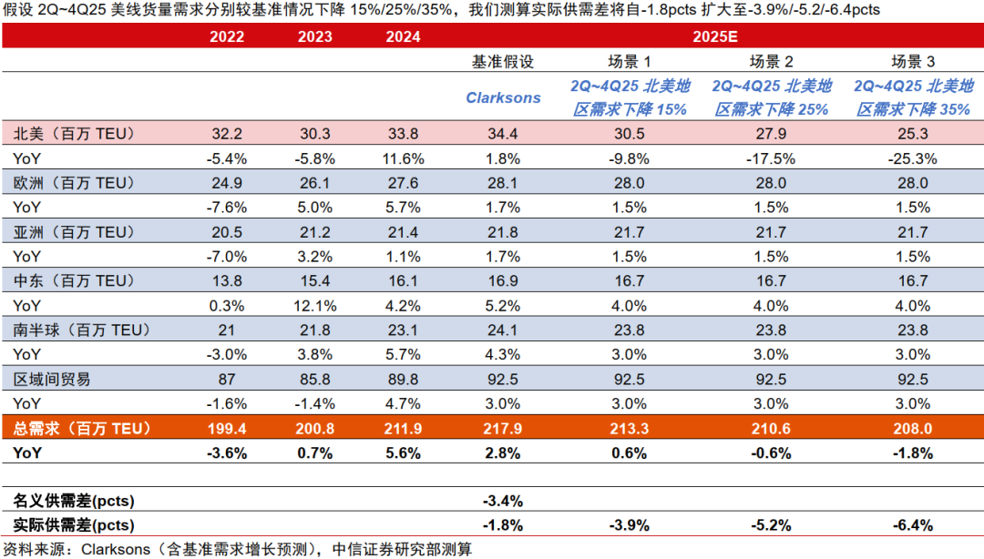 据Clarksons预测,2025年全球集运名义(需-供)增速差-3.4pcts。假设2025年拆解运力和闲置运力占比分别提升至0.6%和3.0%,我们测算实际运力增速收窄1.6pcts至4.6%。假设25Q2~25Q4北美需求下降15%/25%/35%三种工况,我们测算全球集运需求端增速从+2.8%转为+0.6%/-0.6%/-1.8%,实际供需差将自-1.8pcts扩大至-3.9/-5.2/-6.4pcts。