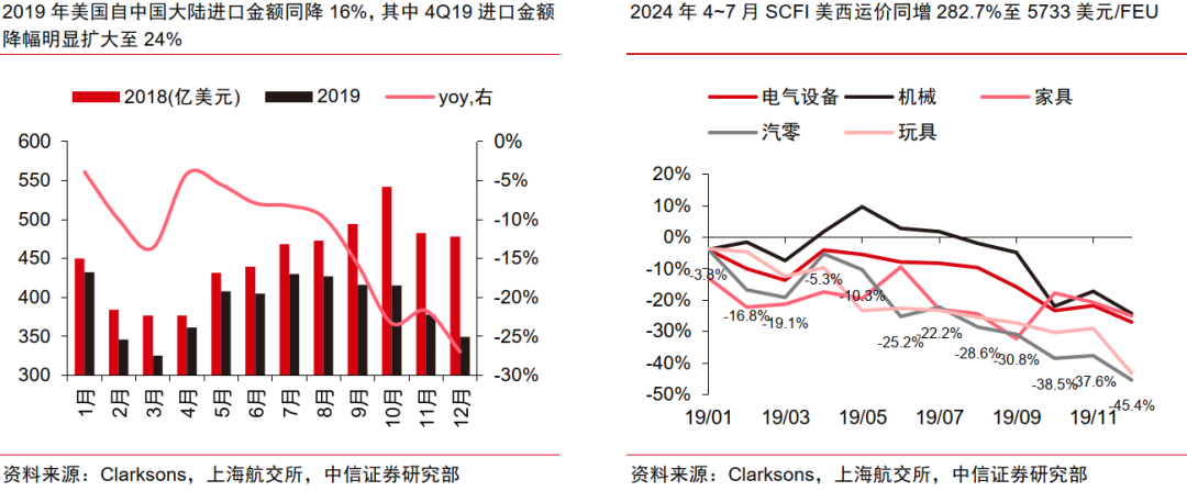 排名前5增长的国家或地区分别为墨西哥、越南、中国台湾省、马来西亚、韩国,分品类看,墨西哥、越南、马来西亚主要增长的品类为汽零&电气设备、电气设备&家具、电气设备。分月度看,2019年中美直航贸易单月最高受损幅度为50%左右(以进口金额计),且具有替代产能的价格敏感型产品更易受影响。