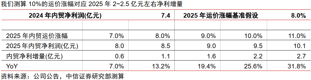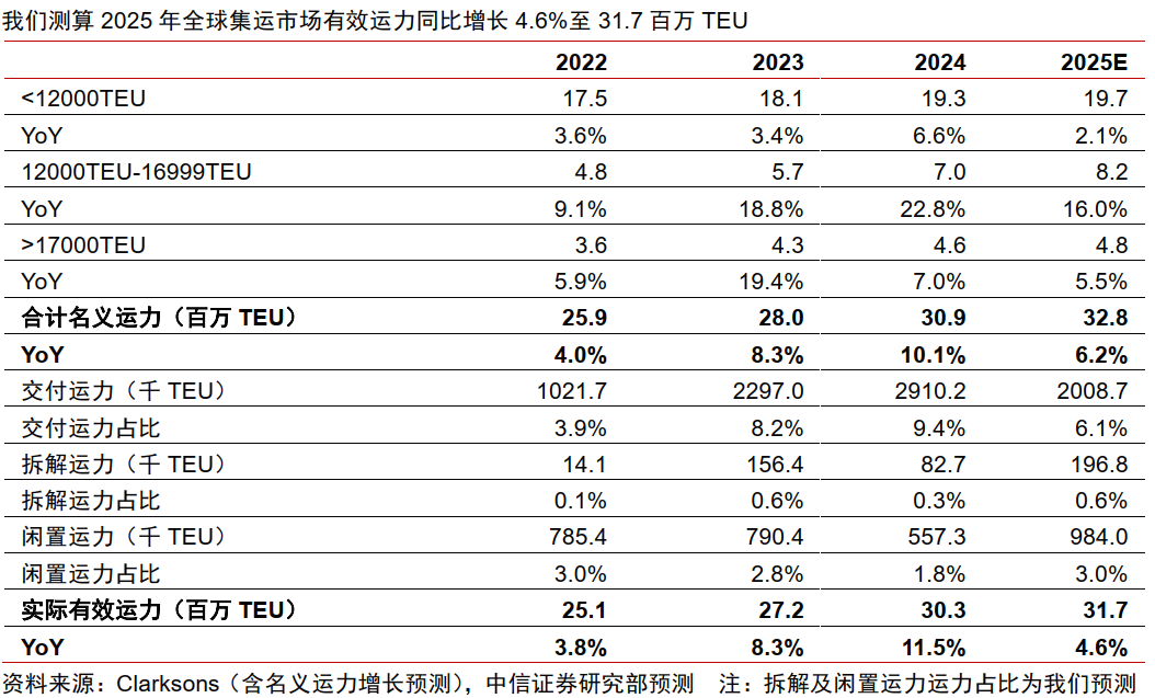 我们预计2025年全球集运市场有效运力(需-供)增速差-1.8pcts,假设2Q~4Q25北美需求下降15%~35%、分工况测算2025年全球集运需求增速或从+2.8%降至0.6%/-0.6%/-1.8%,实际供需差将自-1.8pcts扩大至-3.9/-5.2/ -6.4pcts。