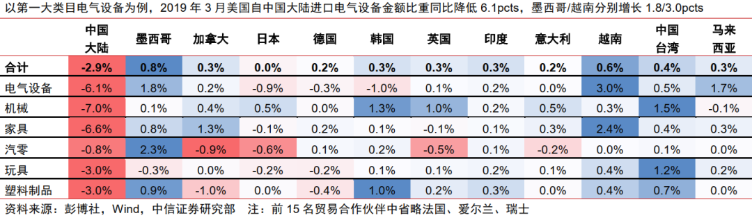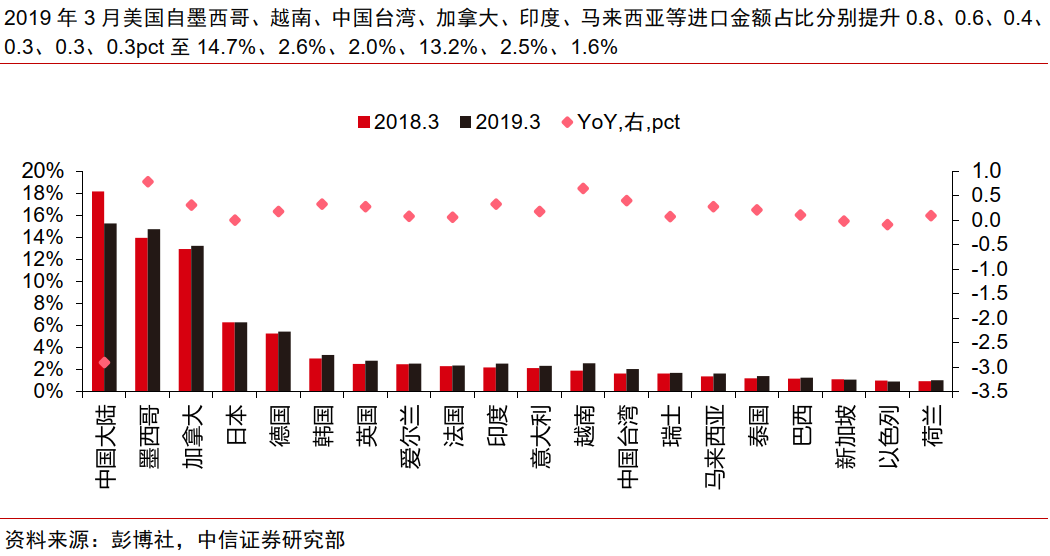 据彭博社,从美国进口结构来看,2019年3月对中国大陆进口占比下降2.9pcts至15.3%、同期自墨西哥/越南/马来西亚进口占比同增0.8/0.6/0.3pct至14.7%/2.6%/1.6%,同月美国自墨西哥/越南/马来西亚进口金额同比增加金额占同期中国大陆减少金额绝对值的48.4%/29.0%/13.1%。