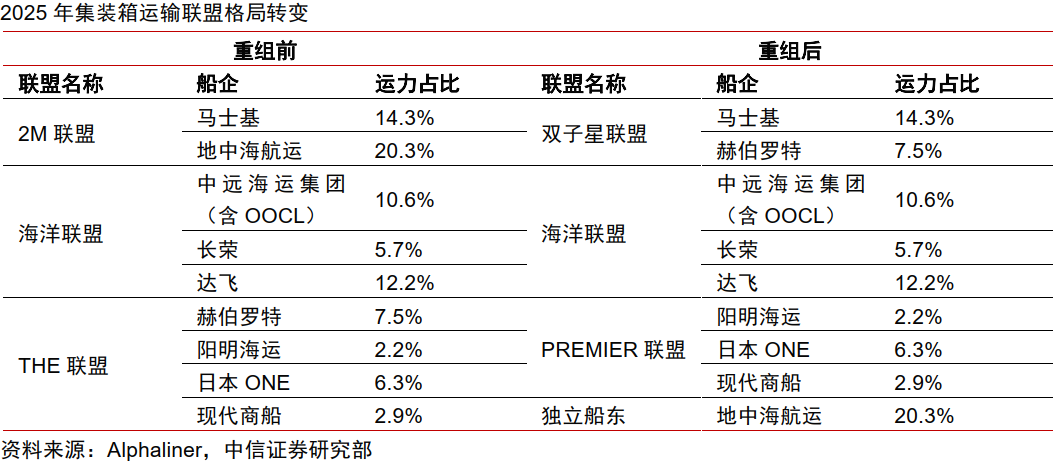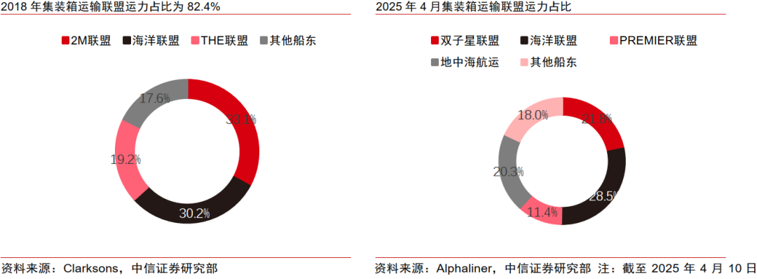 2025年2月全球集装箱航运联盟重组&2M联盟解散,联盟集中度的下降或将导致不同联盟之间的定价竞争有所提升,但仍需时间进一步检验新联盟的成色。关税扰动背景下叠加联盟重塑,或引致全球供应链再次重构。