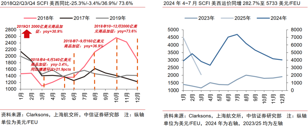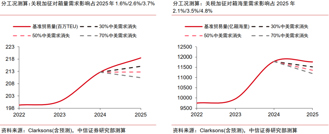 参考上轮贸易摩擦情况,2019年美国自中国大陆进口前五大品类金额中单月最大降幅为45.4%(汽零,2019年12月),我们以集运箱量减少50%作为本轮贸易争端的基准猜想。基于上述假设,我们测算2025年中美线需求降幅30%/50%/70%时,对全球周转量需求(箱海里)影响2.1%/3.5%/4.8%,同时保守假设中美线下降需求中10%由第三国承接转往美国。对应2025年全球集装箱周转量需求同比增速自基准情况-0.2%下降至-2.3%/-3.6%/-5.0%,后续仍需关注关税谈判进展对货流格局的边际变化。