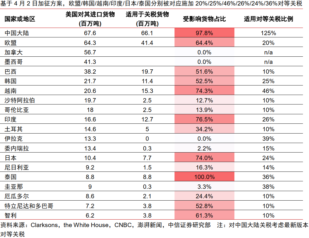 推演极端扰动下,本轮关税加征或致2025年全球集运需求同降5%。后续建议关注部分国家暂缓加征关税90天带来的转口贸易潜在需求,区域集运船东或因此受益。
