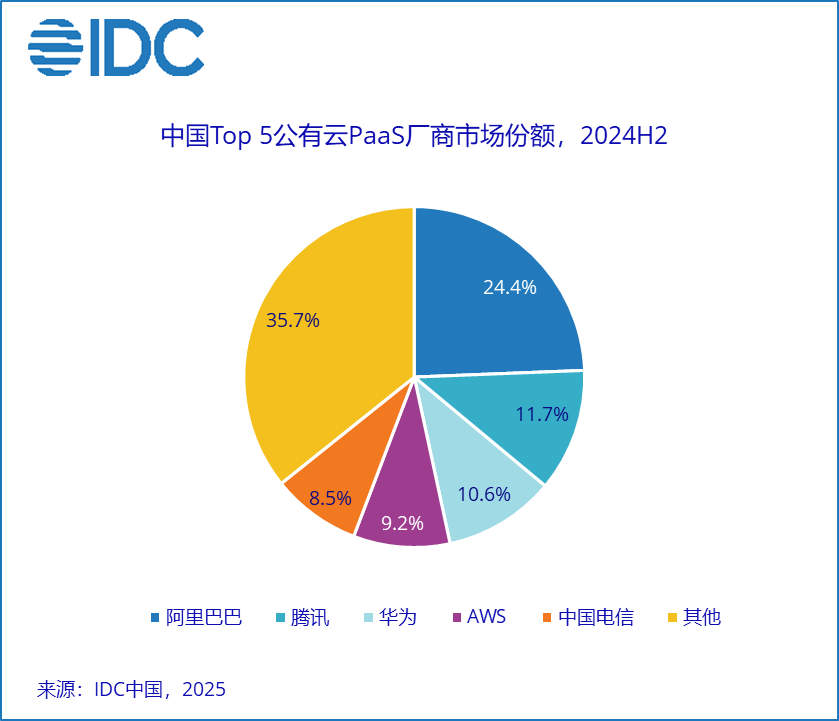 阿里巴巴、腾讯、华为、AWS和中国电信为市场排名前五,市场份额总和64.3%,集中度同比下降0.9%。AI大模型的快速发展为众多PaaS云服务商提供了第二增长曲线和新增赛道,在一定程度上分散了市场前五集中度。