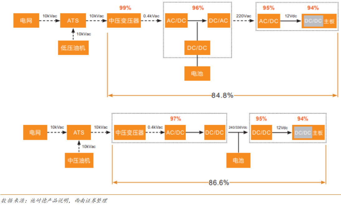 (5)降低成本:从建设成本考虑,HVDC减少了逆变器和STS(静态旁路转换开关),使得建设成本降低25%-50%;从使用成本考虑,得益于效率提升,以市电+336VHVDC方案为例,每年系统损耗相比于市电+交流UPS方案可减少2.31万度电。