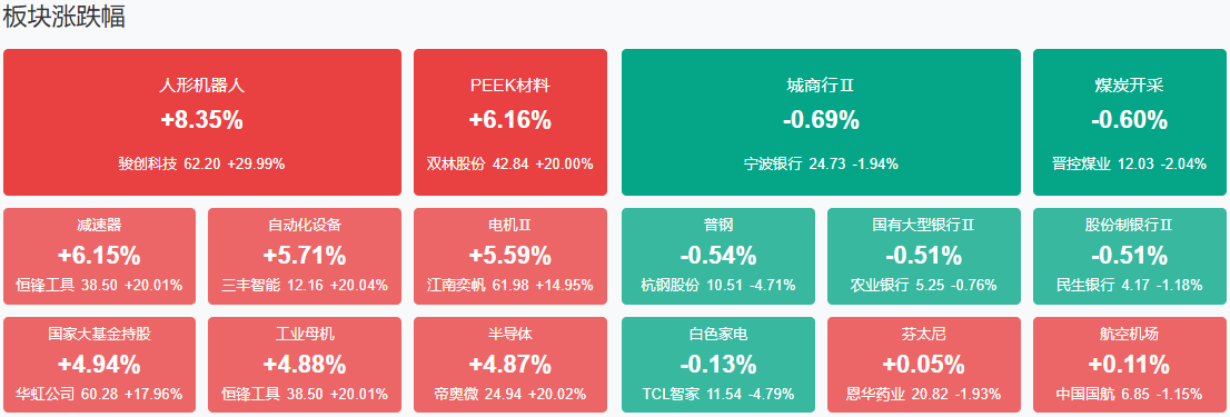板块方面,人形机器人、半导体、存储芯片、可控核聚变、算力等板块涨幅居前;银行等少数板块下跌。