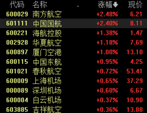 11月17日早盘,机场航运板块表现活跃。截至发稿,南方航空、中国国航涨超2%,海航控股、中国东航、春秋航空等跟涨。