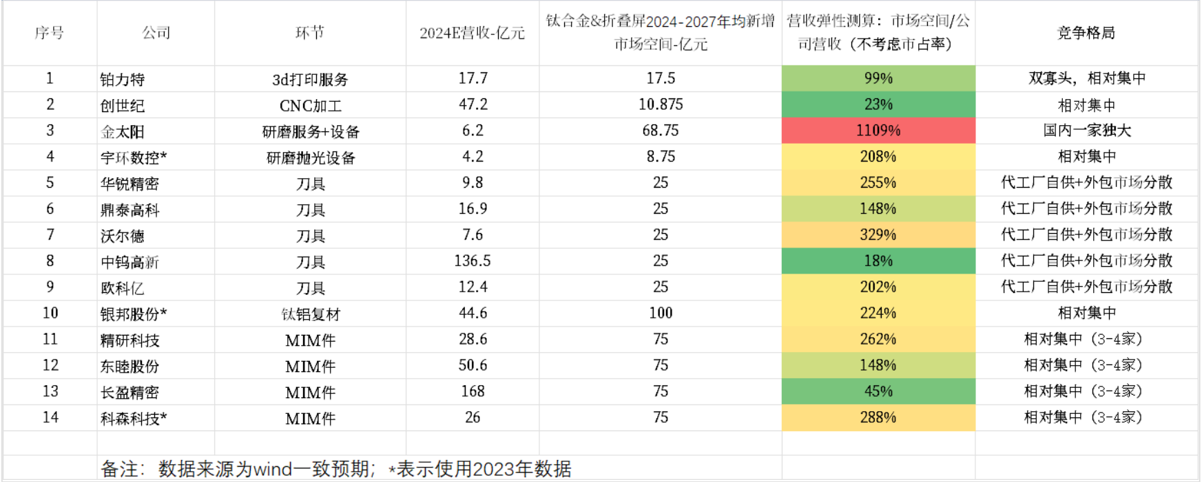 图:折叠屏&钛合金各环节上市公司营收弹性测算