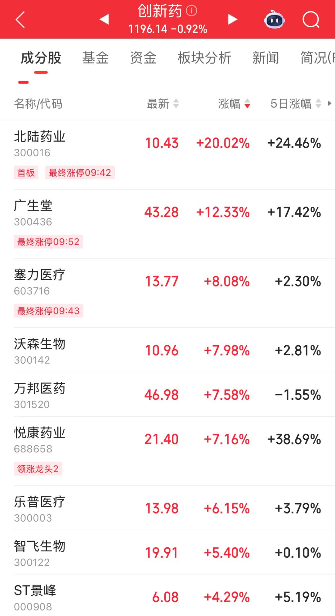 广生堂盘中触及“20cm”涨停板,涨幅靠前的创新药概念股还有塞力医疗、沃森生物、万邦医药、悦康药业等。