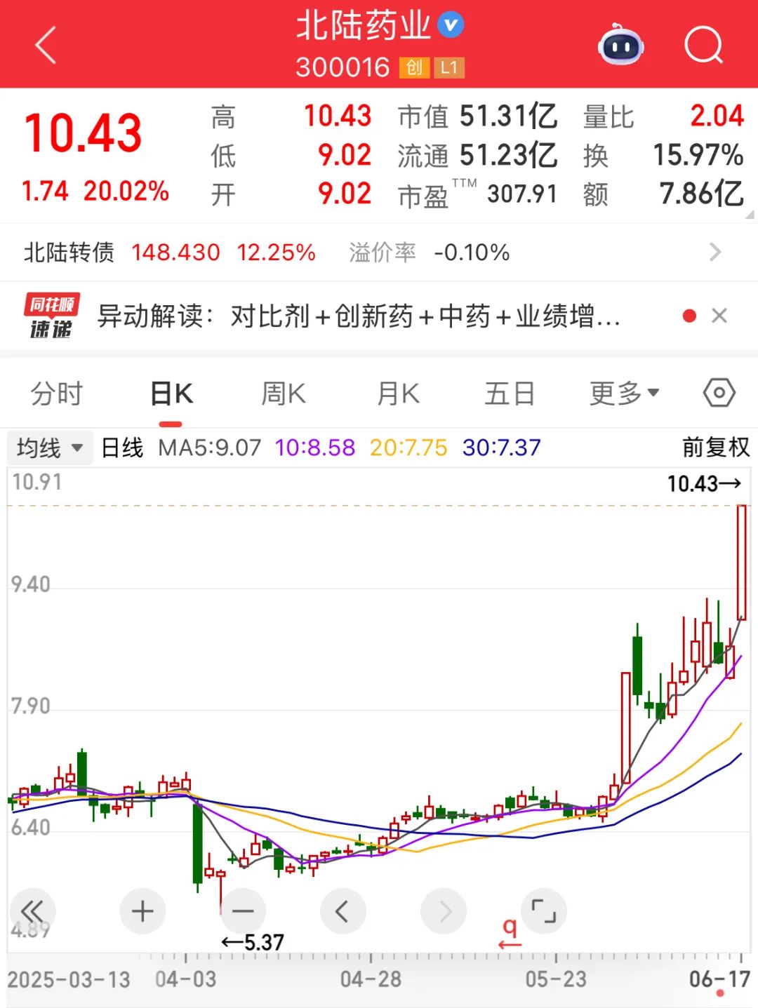 6月17日早盘,创新药概念股北陆药业(300016)高开后迅速拉升,约9时42分封住“20cm”涨停板,盘中涨停板封单一度超过100万手。