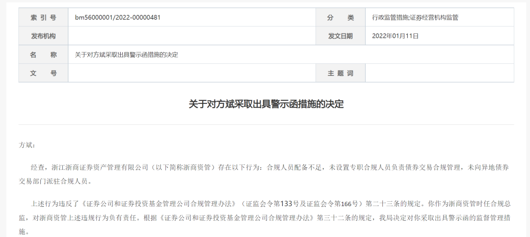 还有一份罚单针对时任合规总监方斌,因“合规人员配备不足,未设置专职合规人员负责债券交易合规管理,未向异地债券交易部门派驻合规人员”,浙江证监局对其采取出具监管警示函的监管措施。
