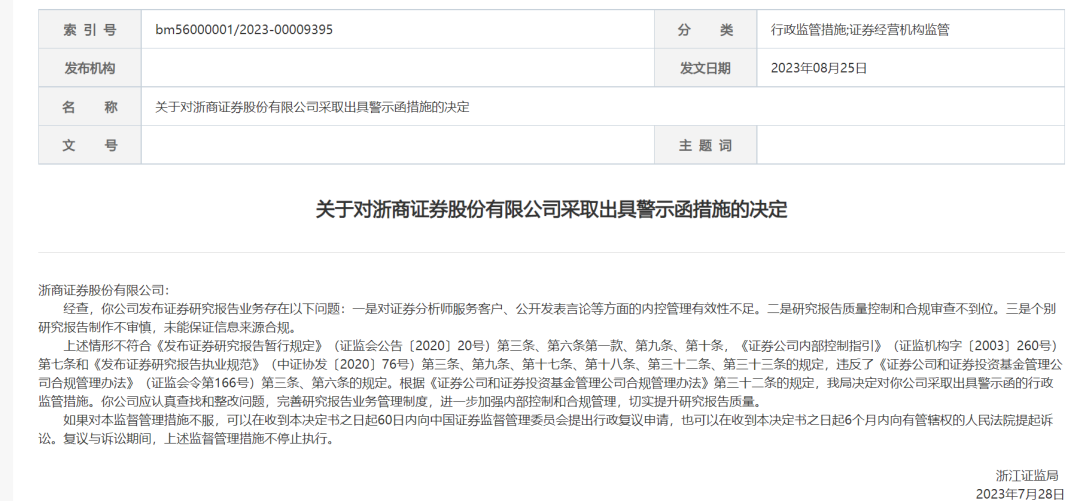 2023年8月25日,浙江证监局发布《关于对浙商证券股份有限公司采取出具警示函措施的决定》指出,经查,浙商证券发布证券研究报告业务存在以下问题:一是对证券分析师服务客户、公开发表言论等方面的内控管理有效性不足。二是研究报告质量控制和合规审查不到位。三是个别研究报告制作不审慎,未能保证信息来源合规。