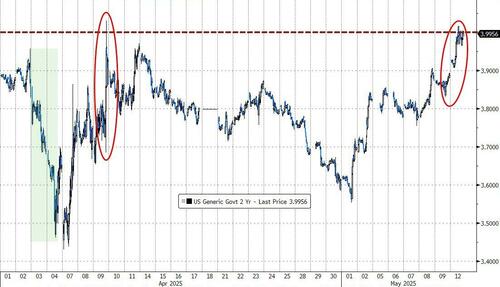 事实上,自美联储上周发表5月议息会议声明、主席鲍威尔主张采取观望态度以评估关税将如何影响通胀和经济增长以来,市场对美联储降息的押注就一直在降温。过去一周,两年期美债收益率从3.55%的低位大幅攀升了逾40个基点,五年期美债收益率也从3.85%左右升至了4.11%。