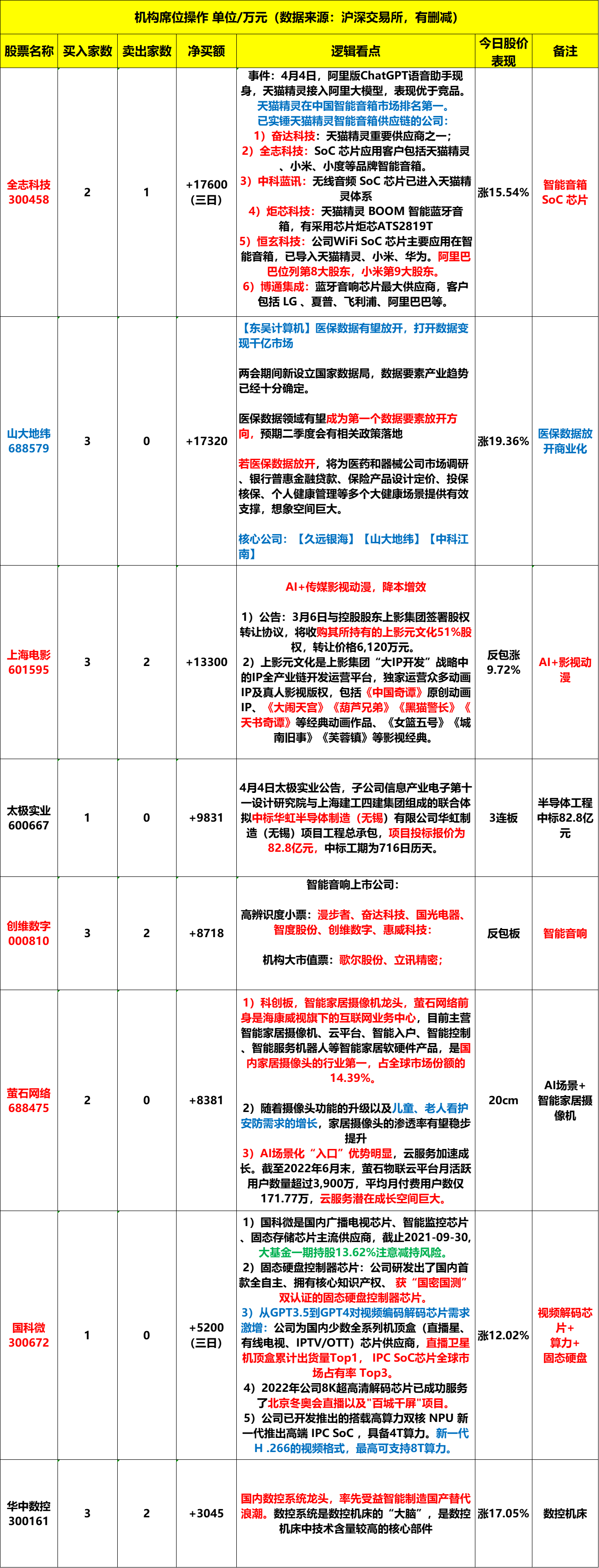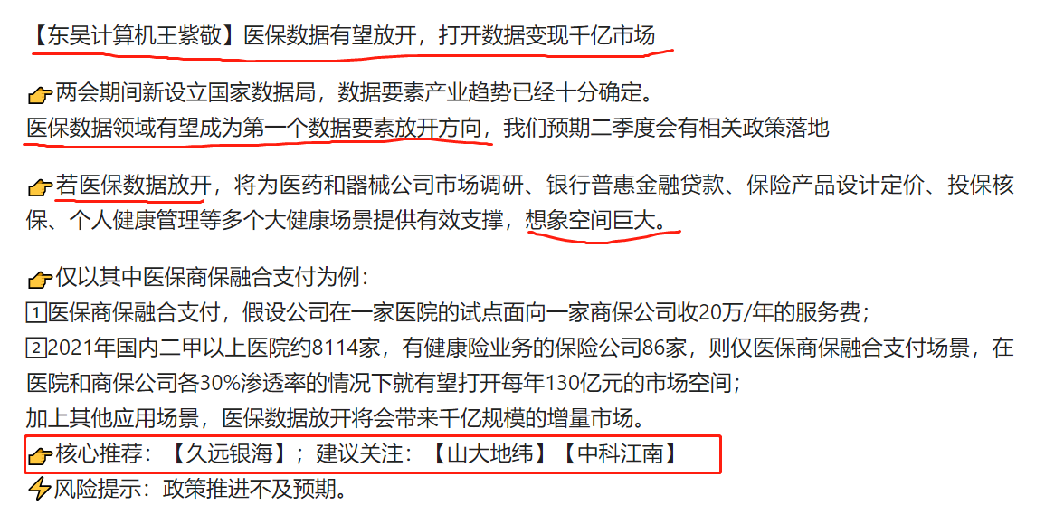 1)核心逻辑:【东吴计算机】医保数据有望放开,打开数据变现千亿市场。医保数据领域有望成为第一个数据要素放开方向,预期二季度会有相关政策落地。若医保数据放开,将为医药和器械公司市场调研、银行普惠金融贷款、保险产品设计定价、投保核保、个人健康管理等多个大健康场景提供有效支撑,想象空间巨大。