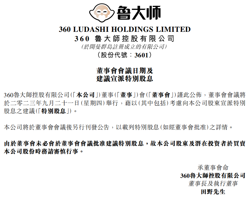 不过,在9月11日,鲁大师突然发了一份公告,打破了这份平静。董事会似乎“良心发现”,表示“公司将于9月21日召开董事会会议,商议向公司股东宣派特别股息的建议。分红的详细情况,将于董事会会议后另行刊发。”